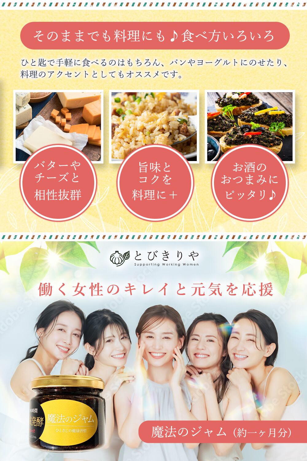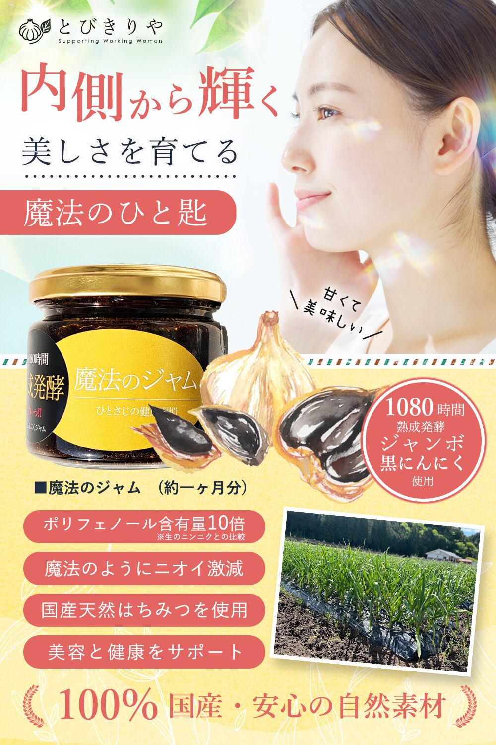 温かみと魅力あふれる「魔法のジャム」は、あなたの毎日を特別なものに変える美味しさを提供します。このジャムは、熟成発酵されたジャンボ黒にんにくを贅沢に使い、手作業で丹念に作られています。スーパーフードと名高い黒にんにくの風味が凝縮され、豊かな味わいを実現。一日ひと匙の健康習慣でそのままスプーンで掬って食べて頂く他、朝食のトーストやヨーグルト、さらにはチーズと合わせてオードブルとしても、どんなシーンでも活躍する一品です。大切な人へのギフトとしても喜ばれること間違いなしです。